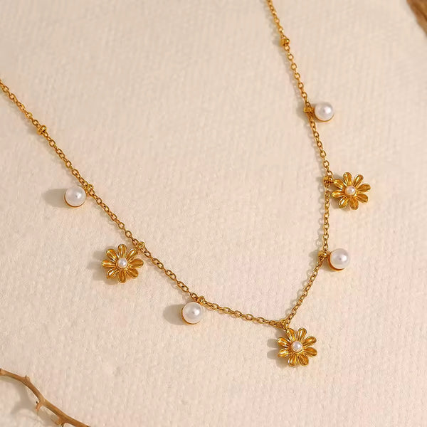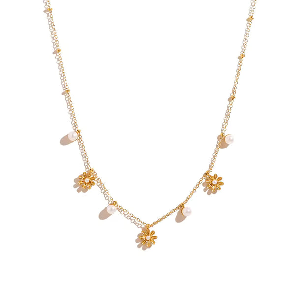 Delicately crafted with shimmering white pearl stones in a graceful flower design, this necklace adds a touch of timeless elegance to any look. Perfect for both everyday wear and special occasions.